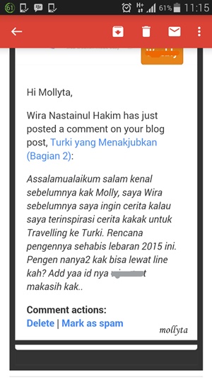 Salah satu screenshot komentar dari pembaca blogku yang terinspirasi ingin ke Turki (komentar ada di blog terdahuluku mollyta.weebly.com)