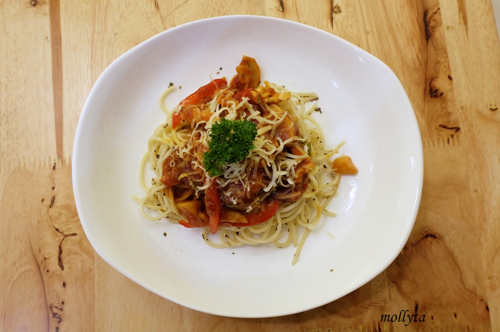 Sambil mengobrol, kamipun diberikan kesempatan untuk memesan dan mencicipi menu disini sesuai selera. Aku lantas minta rekomendasi menu favorit yang tersedia disini. Akhirnya pilihan jatuh pada pasta dan nasi untuk main course.