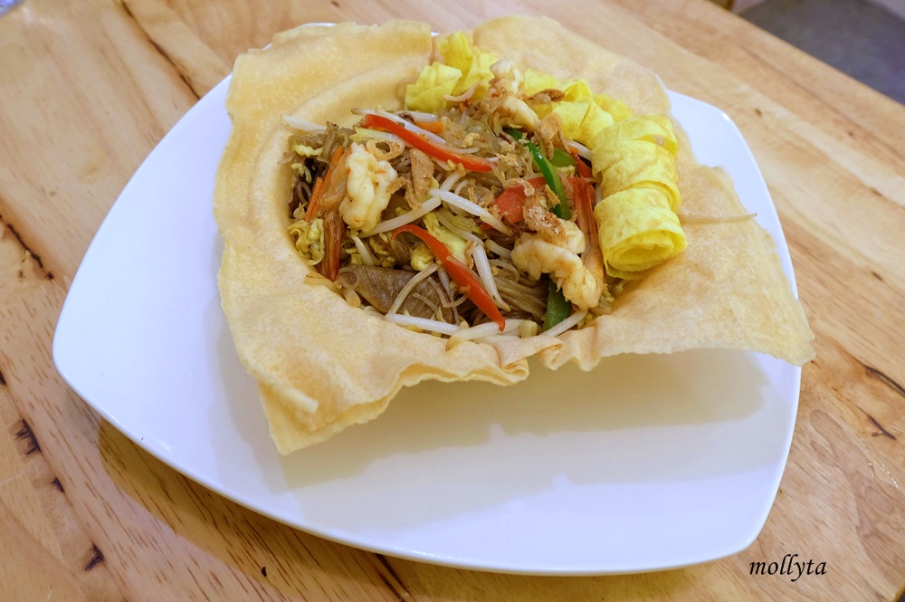 Oya, malam itu aku juga mengajak temanku Yoga untuk ikut icip-icip disini. Iapun memesan Rice Noodle Pattaya sebab lagi gak ingin makan nasi (katanya). Hidangan ini dilengkapi dengan potongan telur dadar, udang, cumi-cumi dan potongan jamur serta dihidangkan di dalam sebuah “mangkuk” yang juga bisa disantap. Menurut dia rasa mie nya agak sedikit tawar bila disantap tanpa isi yang menyertai hidangan ini *aku gak ikut nyicipin rasanya. Secara keseluruhan rasanya sih cukup nikmat.
