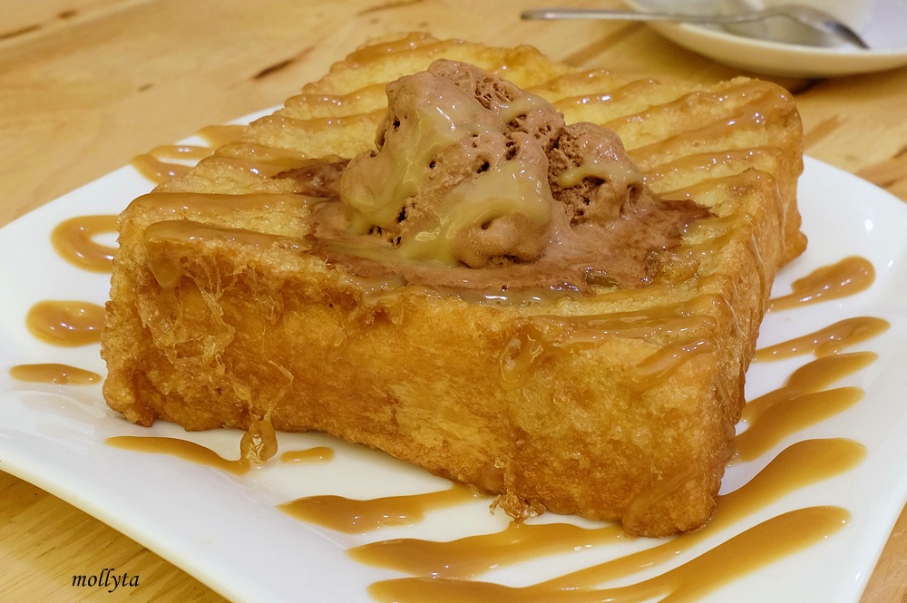 Makan rasanya belum komplit kalau belum mencicipi hidangan penutup. Akupun memesan seporsi Toast with Ice Cream untuk kami nikmati. Awalnya sedikit kaget sewaktu hidangan ini muncul, porsinya itu loh… gede banget ! Kayaknya gak bakalan habis kalau dimakan sendiri… hahaha. Roti toast-nya sendiri cukup besar dan tebal (dan sepertinya dicelupkan ke dalam telur sebelum di-toast) dan dihidangkan dengan 1 scoop ice cream yang bisa dipilih rasanya. Wow… gimana gak kekenyangan tuh? *perut langsung begah*. Mungkin lain kali porsinya bisa agak dikecilkan sedikit ya biar gak eneg pas menyantap dessert. Kalau citarasa siy lumayan enaklah.