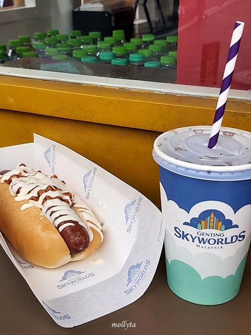 Usai menjajal wahana tadi, tak terasa perut mulai lapar. Aku sempat membeli jajanan mirip hotdog berikut minuman bersoda. Oh ya, di tempat ini tidak menerima pembayaran secara tunai, ya. Jadi pengunjung wajib membayar dengan kartu debit maupun kartu kredit.